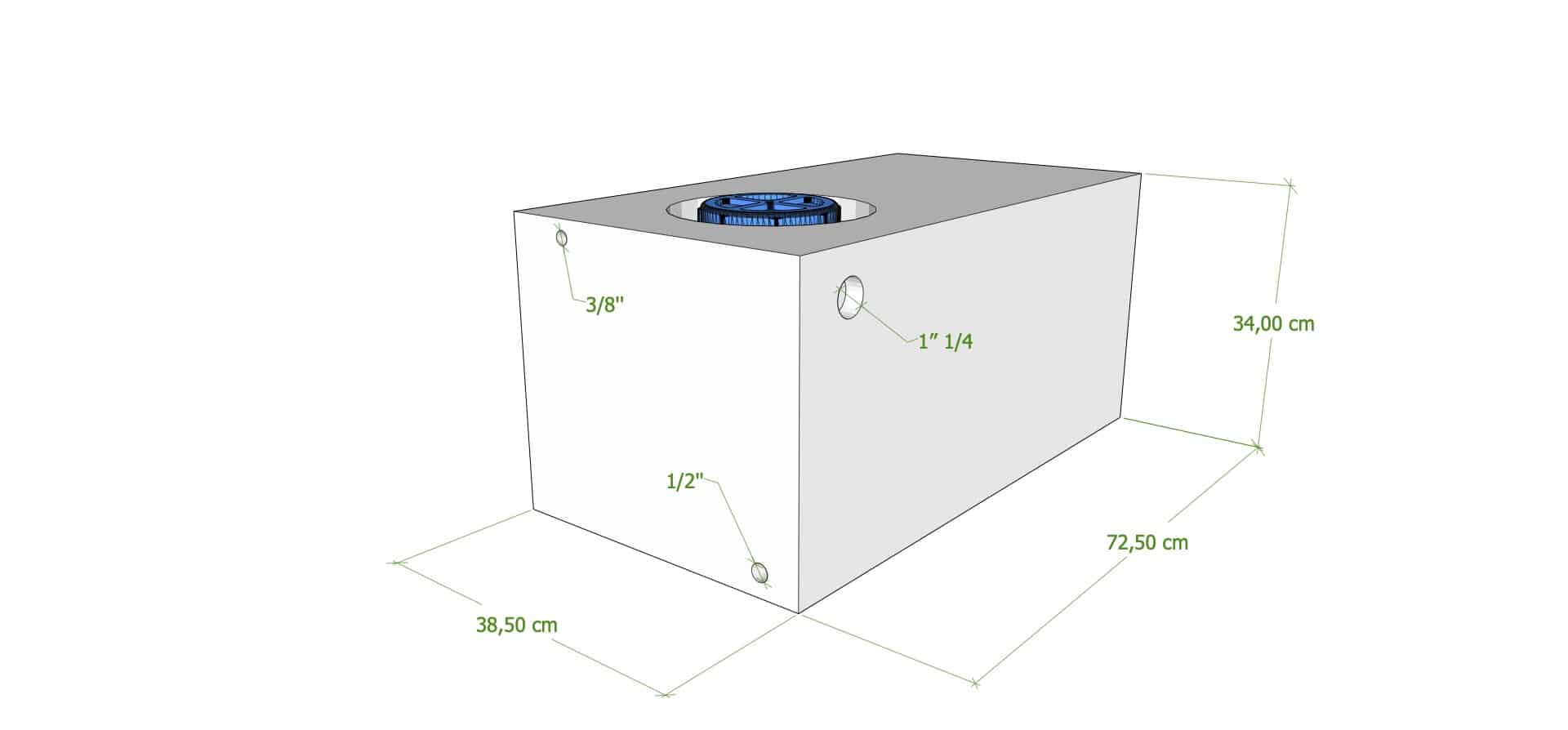 Grazie alle sue dimensioni compatte (73×39×34 cm), può essere installato facilmente in spazi ridotti, mantenendo comunque una capacità generosa. Il tappo a vite femmina verde assicura una chiusura ermetica e pratica, riducendo il rischio di perdite e facilitando le operazioni di riempimento o manutenzione.