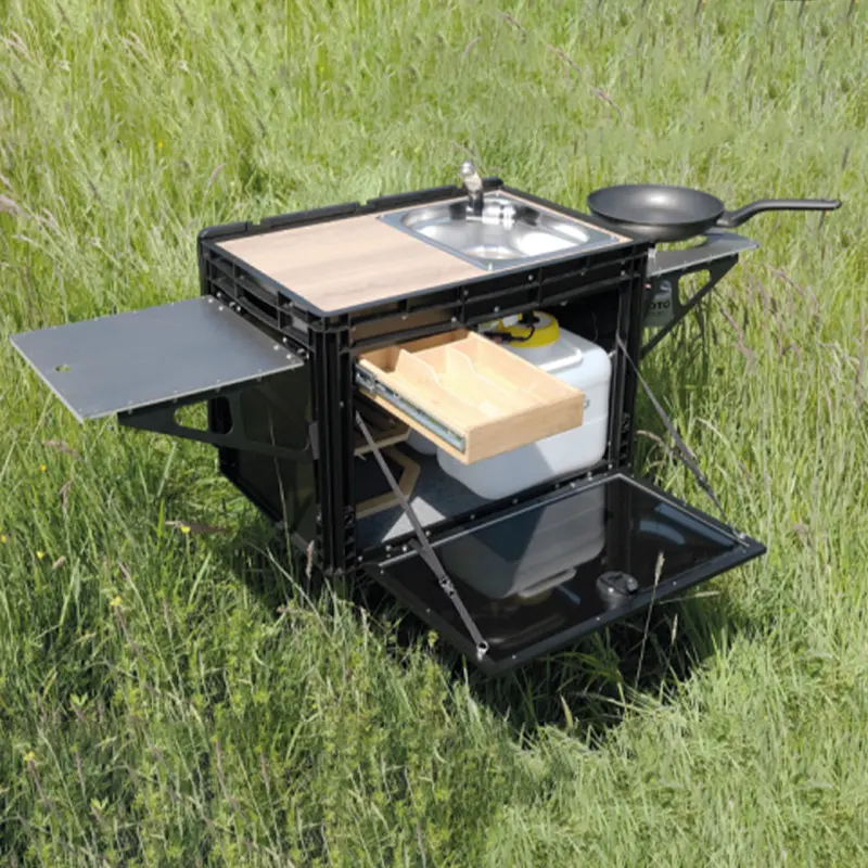 Cucinare all’aperto non è mai stato così facile. La nostra Outdoorkitchen è una cucina portatile e autosufficiente in formato Eurobox, che si monta e si ripiega in pochi secondi. Una volta chiusa, funziona come una normale Eurobox: compatta e facile da riporre. A bordo ci sono due serbatoi da 10 litri per acqua fresca e di scarico, un rubinetto alimentato a batteria e un bruciatore a gas posizionato sul lato destro (opzionalmente sul lato sinistro). Questo permette di cucinare, lavare e godersi la vita all’aria aperta senza dover entrare e uscire continuamente dal veicolo. Intelligente, compatta e perfettamente progettata per la vita in camper.